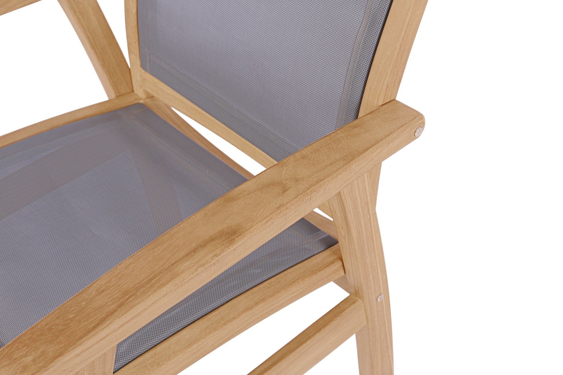 - Material: Solid Teak frame with a durable fabric sling seat.
